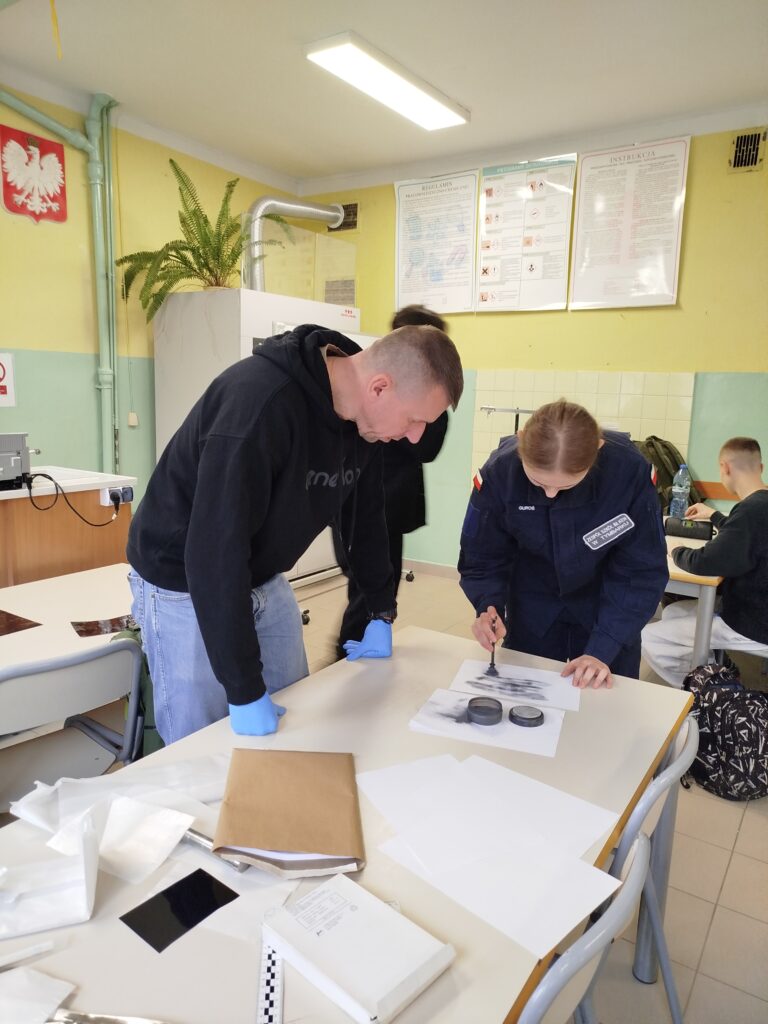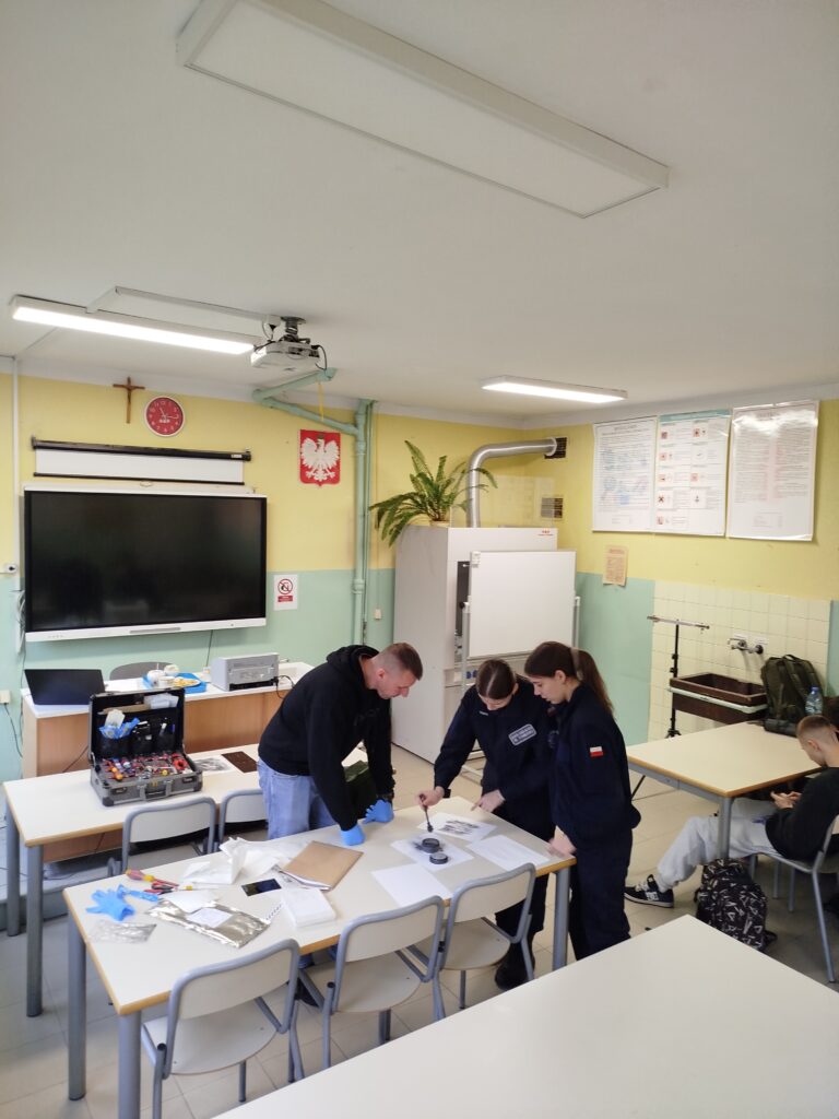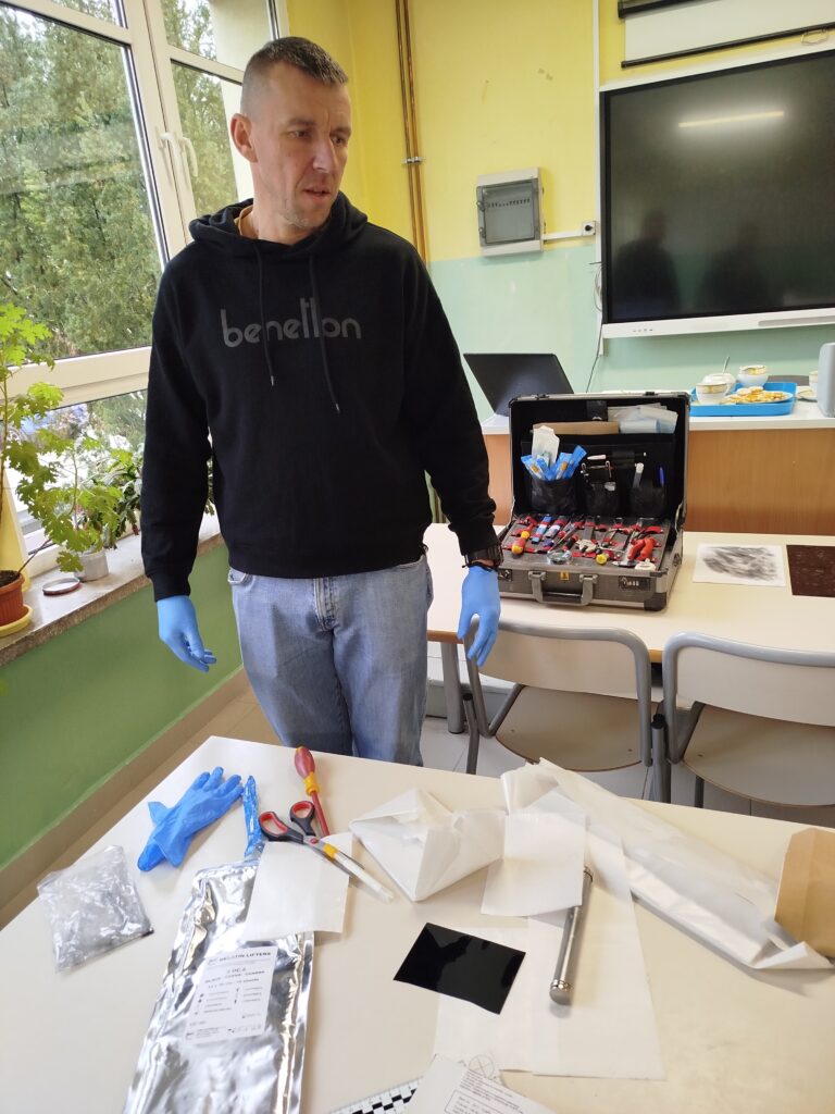 W dniu 25 lutego w naszej szkole gościł technik kryminalistyki z KPP w Limanowej, który w klasach „policyjnych” zaprezentował młodzieży sposoby oraz narzędzia służące do ujawniania i zabezpieczania śladów kryminalistycznych. Uczniowie mieli możliwość poznania specyfiki pracy technika oraz mogli samodzielnie wykorzystać sprzęt, którym technik posługuje się na miejscu zdarzenie kryminalnego.