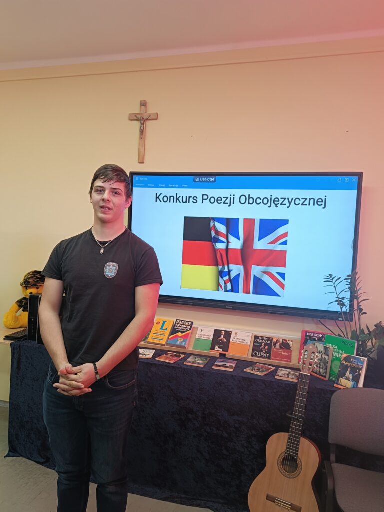 – Igor Ślusarski z klasy 3cOPW – prezentujący wiersz Johanna Wolfganga von Goethe